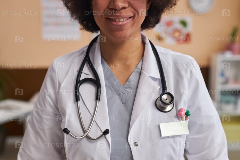 Черная женщина как педиатр, носящий лабораторное пальто в клинике