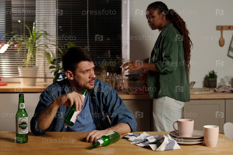 Депрессивный мужчина пьет пиво за столом