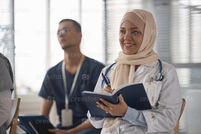 Улыбающаяся женщина-практик здравоохранения с блокнотом на конференции