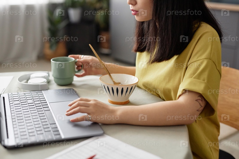 Молодая азиатская женщина работает на ноутбуке дома