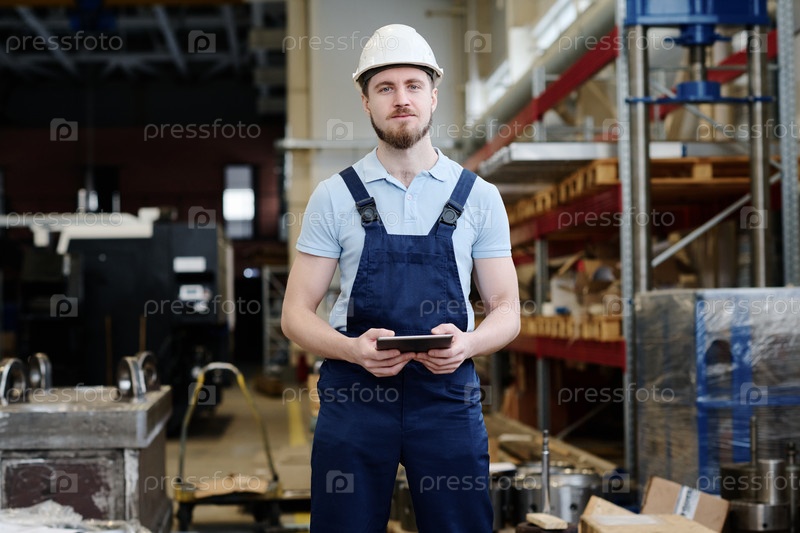 Молодой мужской фабричный рабочий с цифровым планшетом