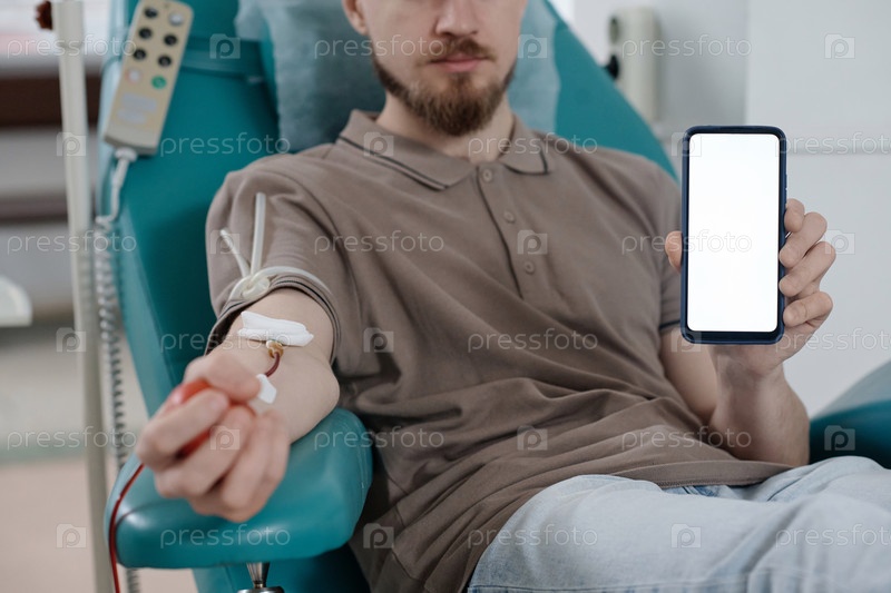 Молодой донор крови демонстрирует дисплей смартфона перед камерой
