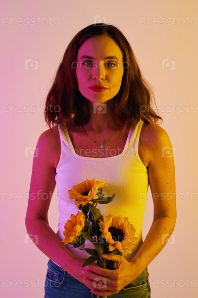 Не улыбающаяся брюнетка держит подсолнухи