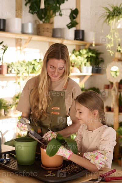 Мама и ребенок пересаживают комнатные растения