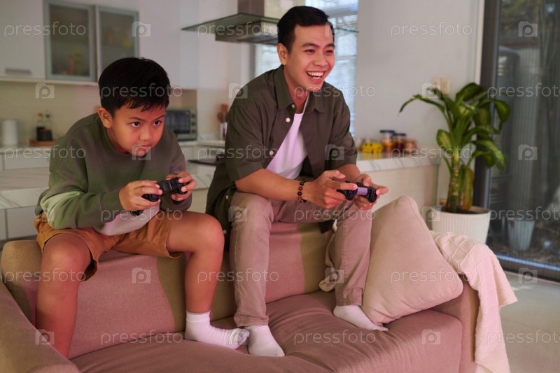 Играя в видеоигры с отцом мальчиком