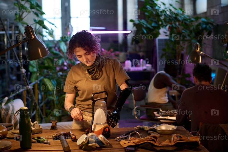Молодая женщина с инвалидностью собирает лампу