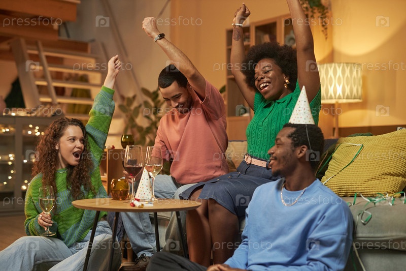 Разнообразные люди радуются счастливо на уютной вечеринке