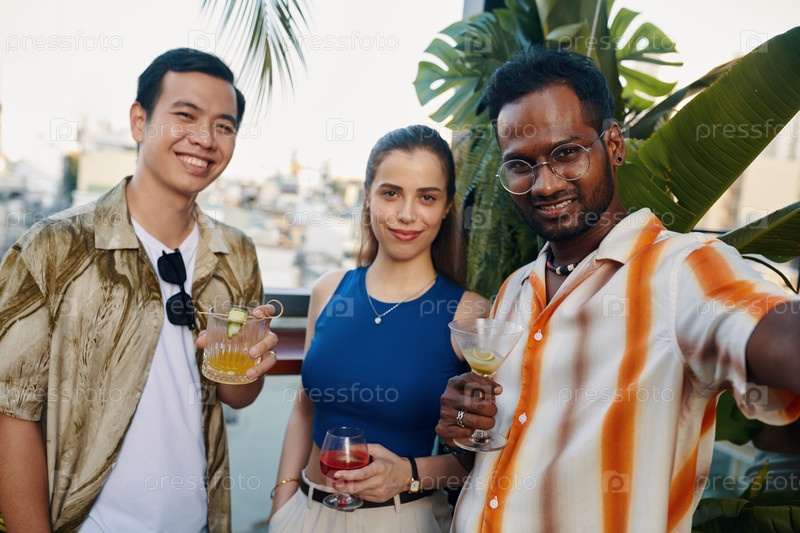 Люди с напитками, которые делают селфи