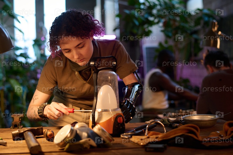 Молодая женщина с протезом ремонтирует лампу