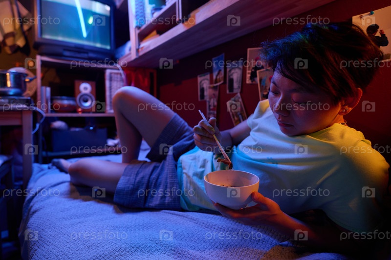 Девушка отдыхает на кровати и ест