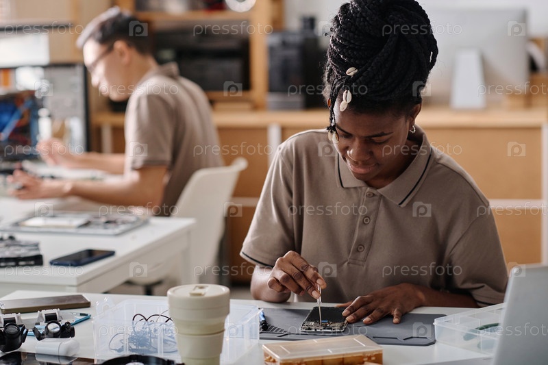 Афроамериканская женщина, ремонтирующая смартфон на столе мастерской