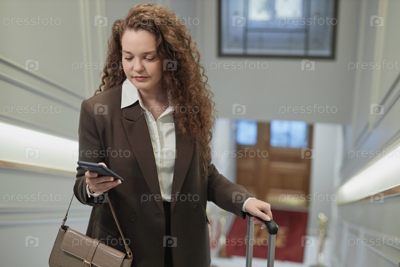 Деловая женщина с чемоданом в гостиничном лобби