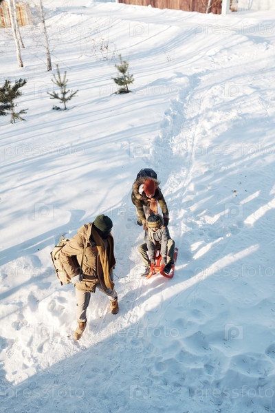 Семья едет на санях зимой