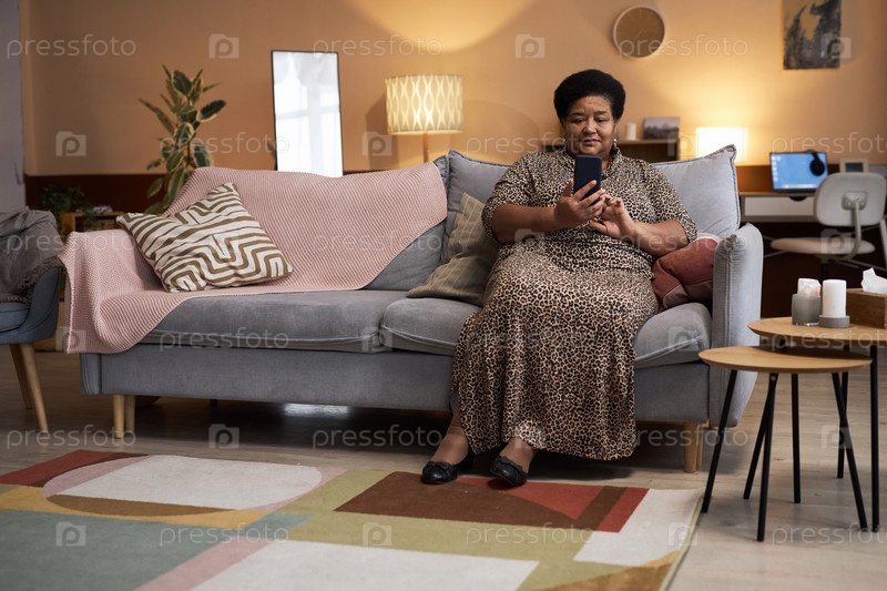 Чёрная старшая женщина использует телефон в уютной гостиной