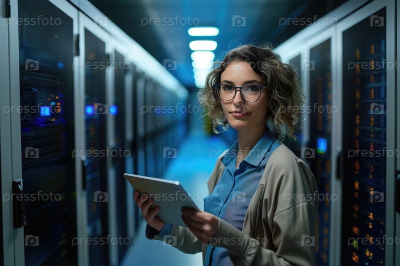 Женщина держит планшет, стоящий в серверной комнате Ai