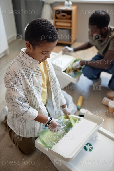 Черный мальчик сортирует пластик