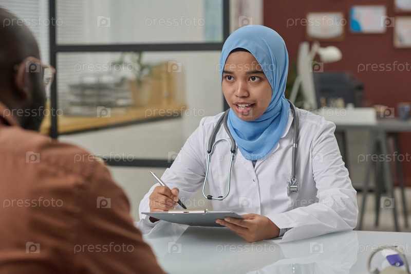 Женщина-медицинский работник, проводящая встречу с чернокожим пациентом мужского пола
