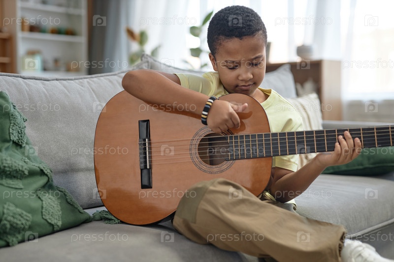 Афроамериканский мальчик играет на гитаре дома