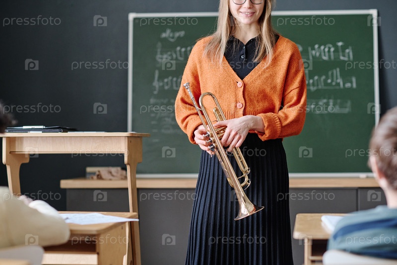 Музыкальный учитель держит трубу, работая с детьми