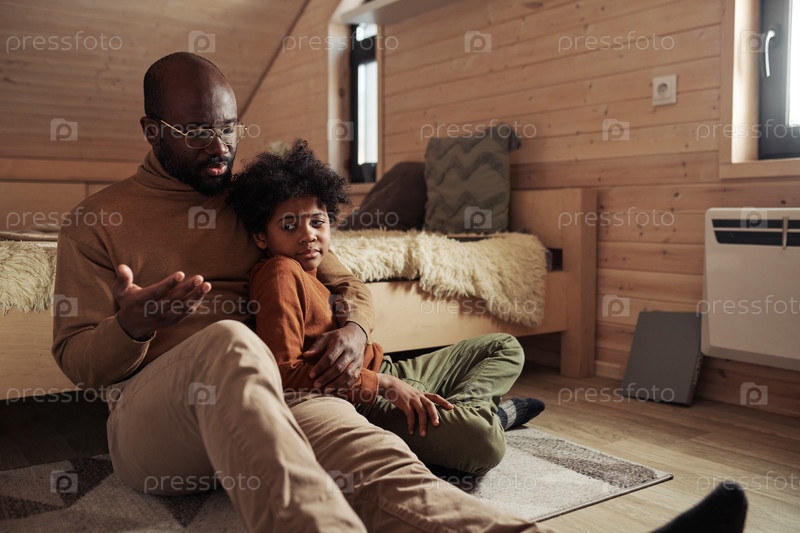 Молодой человек разговаривает со своим сыном в коттедже