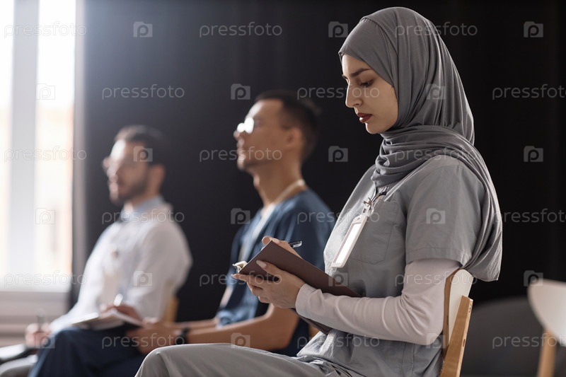 Женщина-доктор пишет в блокноте во время конференции