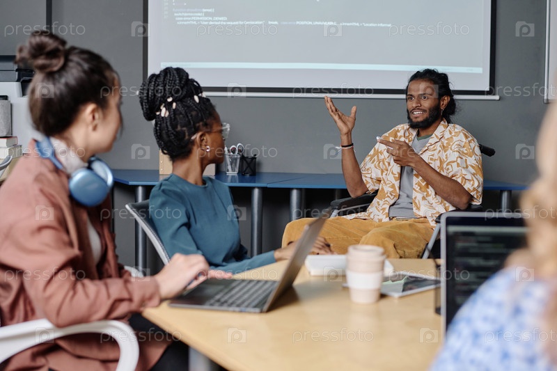 Индийский офисный работник с инвалидностью дает презентацию своим коллегам-женщинам