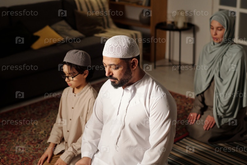 Мусульманин и его семья совершают мусульманский намаз