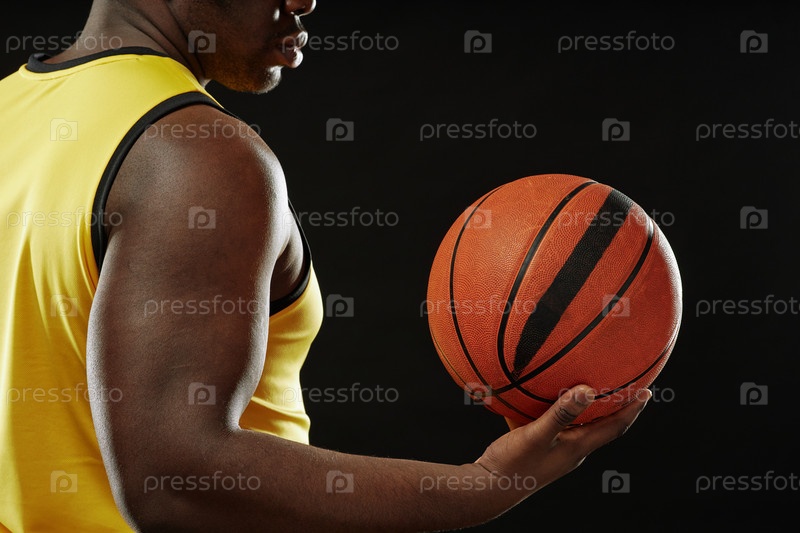 Черный баскетбольный игрок держит мяч с пространством для копирования