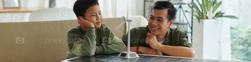 Отец и сын смотрят на рабочую модель ветряной турбины