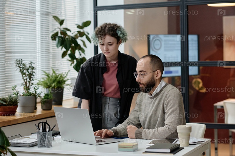Молодые офисные работники изучают информацию на экране компьютера