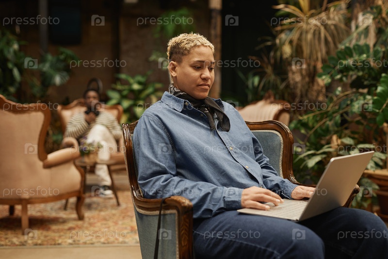 Черная девушка с короткими волосами использует ноутбук в винтажном офисе