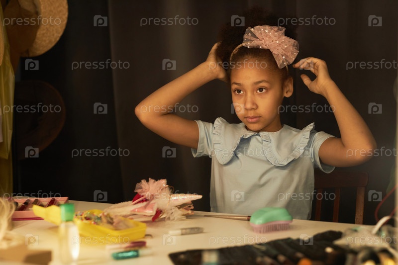 Черная девушка смотрит в зеркало за кулисами