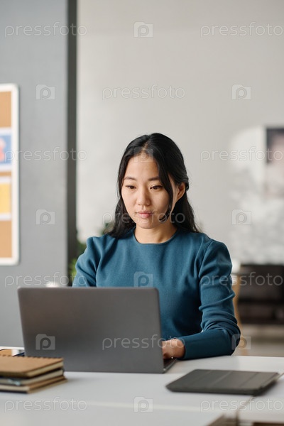 Азиатская женщина-менеджер отправляет текстовые сообщения на ноутбуке