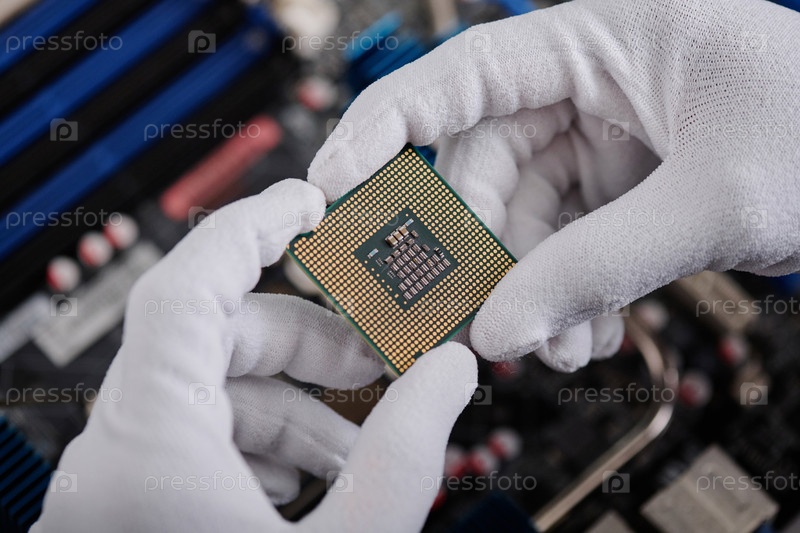 Руки электронного механика, удерживающего центральное обрабатывающее устройство