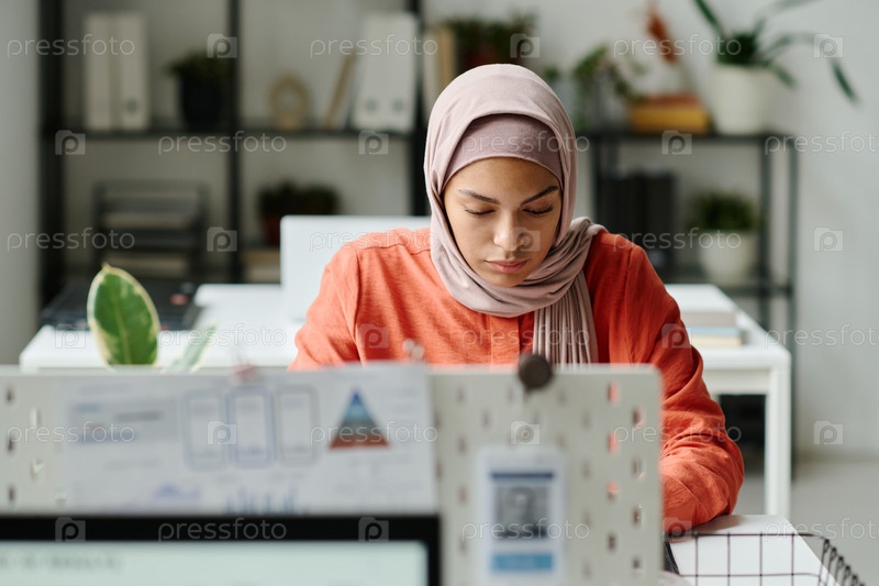 Деловая женщина в хиджабе, сидящая на посту