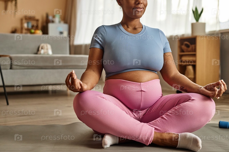Беременная женщина во время практики йоги дома