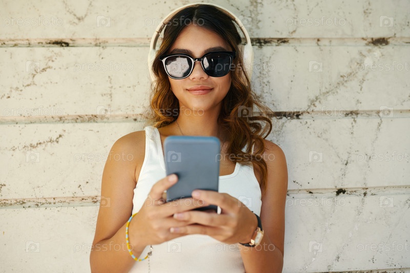 Улыбающаяся девушка слушает музыку