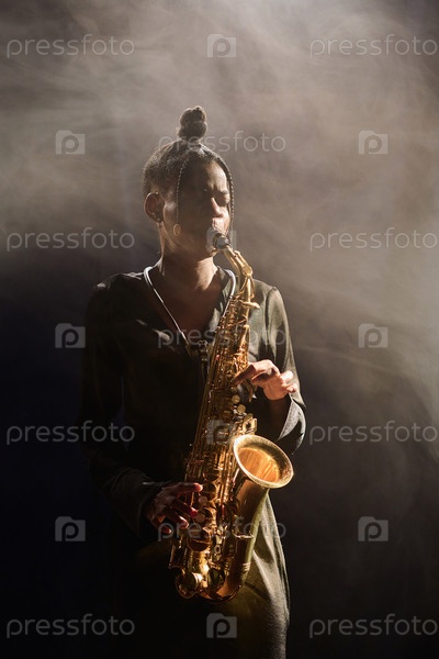 Элегантная чернокожая женщина играет джазовую музыку на сцене
