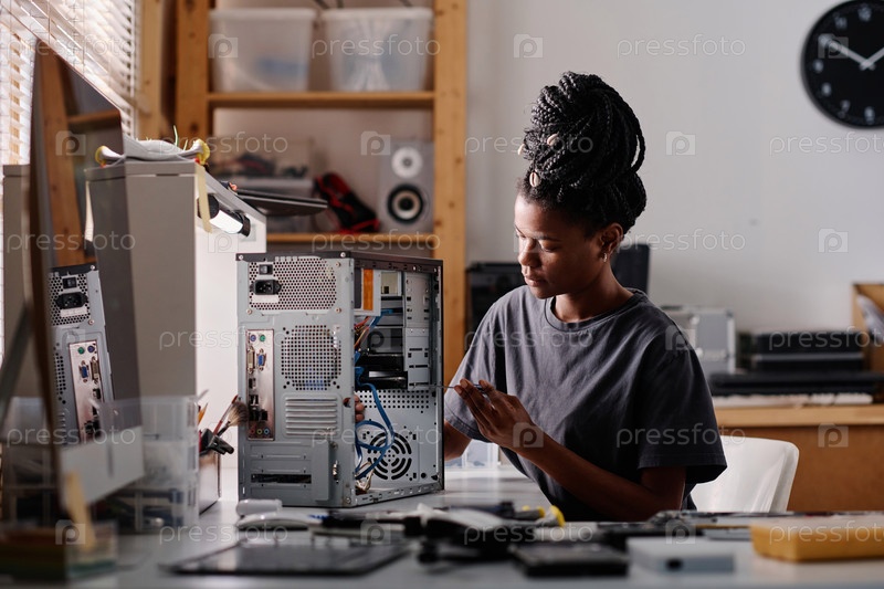 Афроамериканская женщина, ремонтирующая системы Компьютерный блок в мастерской