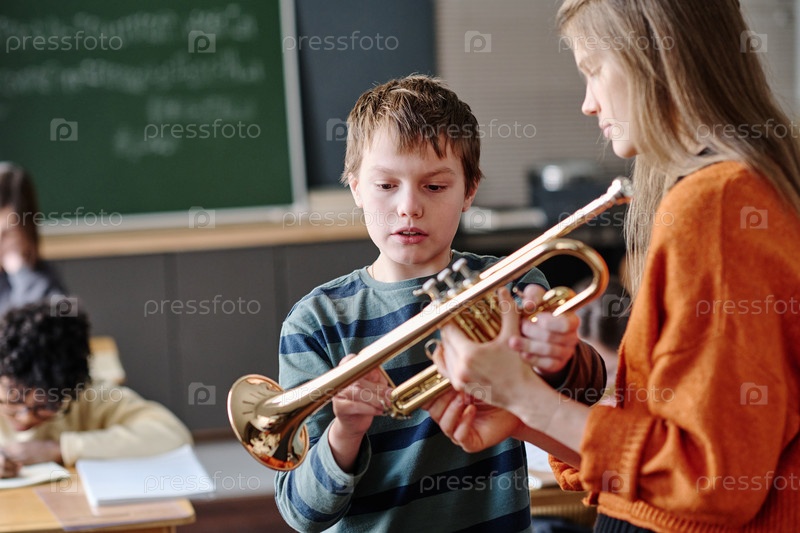 Молодой учитель музыки дарит трубу ученику