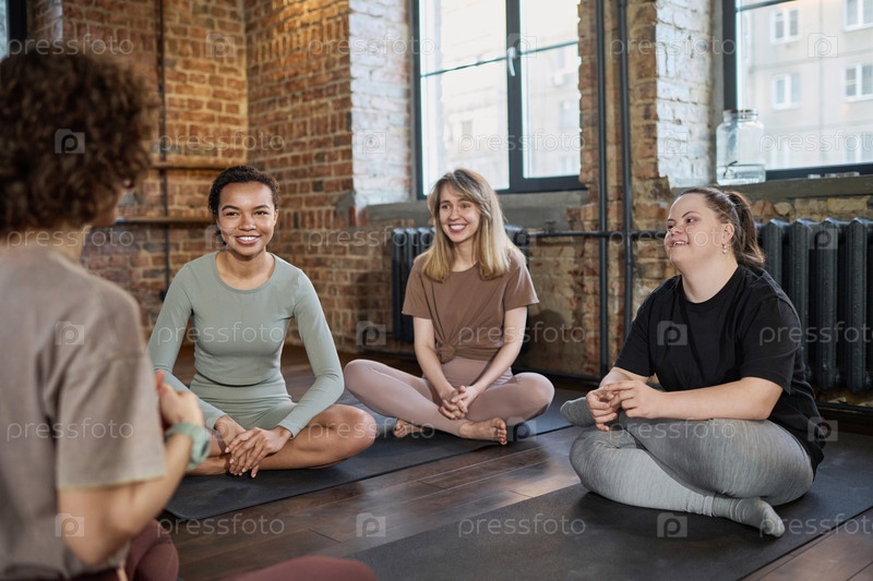 Активные девушки, разговаривающие с фитнес-тренером