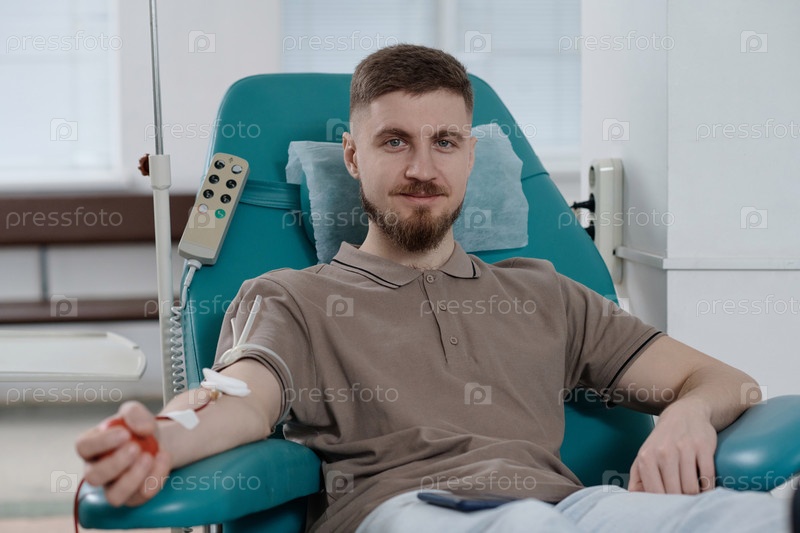 Веселый донор крови сидит в медицинском кресле и смотрит на камеру
