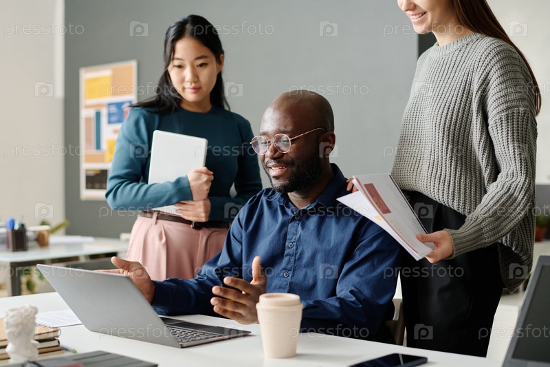 Черный мужчина показывает коллегам презентацию на ноутбуке