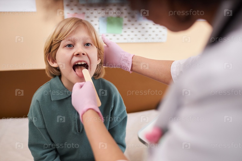 Открытие рта для обследования горла в клинике Мальчик