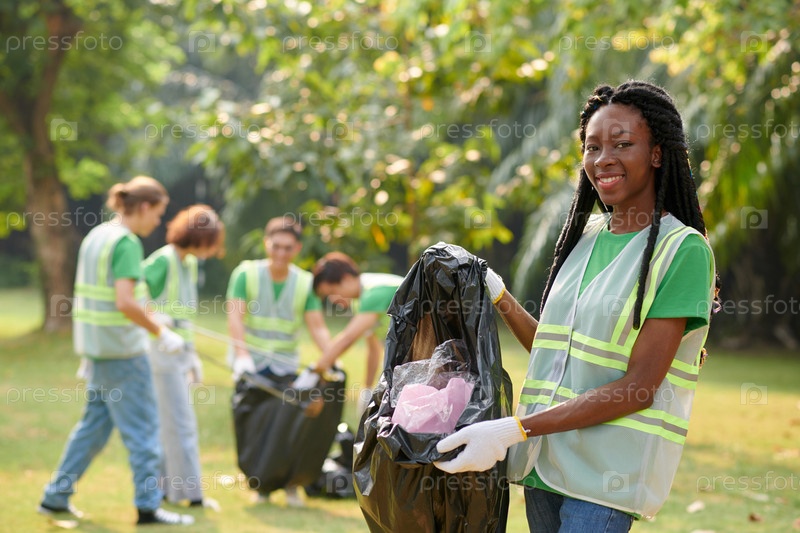 Эко-доброволец показывает мешок с мусором