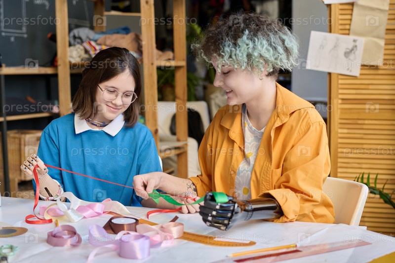 Две девочки-подростки с протезированными руками на уроке шитья