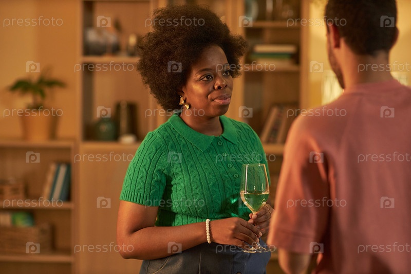 Черная женщина держит бокал вина и разговаривает с другом
