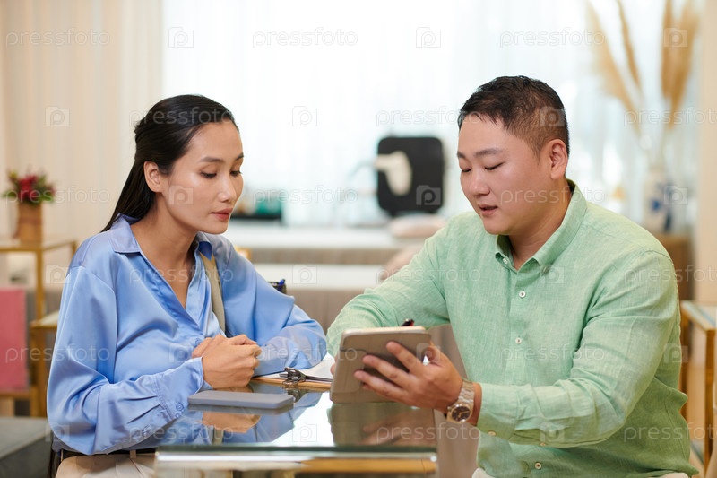 Рецепционистка помогает клиенту выбрать процедуру