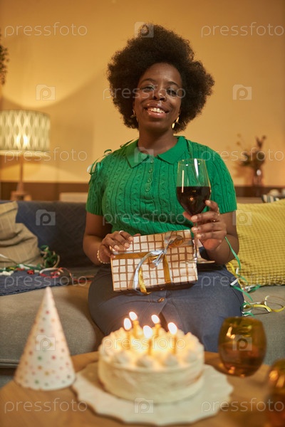 Черная женщина наслаждается празднованием дня рождения с тортом
