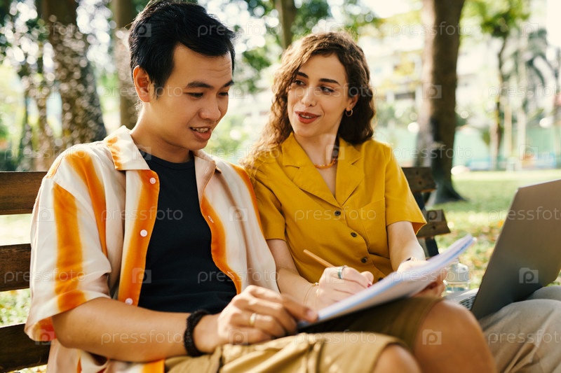 Пара обсуждает эскиз в блокноте